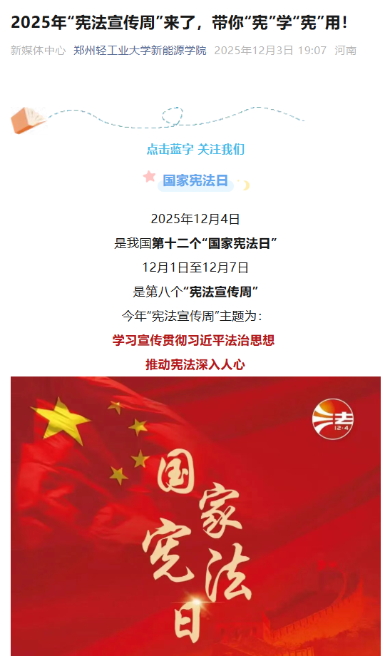 为全面学习贯彻党的二十大和二十届历次全会精神,深入学习贯彻习近平法治思想,落实全国全省教育大会精神,加强宪法法治教育,弘扬宪法精神、维护宪法权威,在第十二个国家宪法日到来之际,完美世界电子竞技对战平台 于12月1日至7日围绕“学习宣传贯彻习近平法治思想,推动宪法深入人心”主题,开展“宪法宣传周”系列活动,将宪法法治教育融入校园生活,让法治信仰在学子心中落地生根。