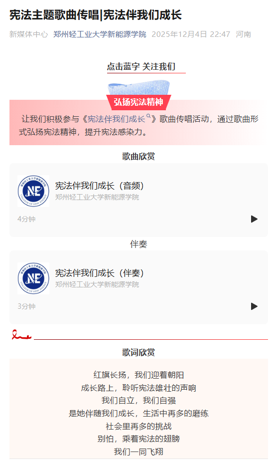 与此同时,电竞平台 依托官方微信公众号推出“宪法宣传周”专题学习栏目,推送宪法学习科普、《宪法版我们成长》传唱等内容,通过图文、音画结合的形式,将复杂的法律知识转化为通俗易懂的生活指引。